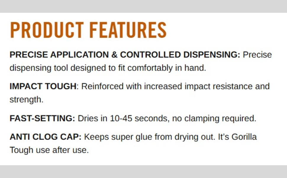 Our same strong and fast Gorilla Super Glue formula, now in a precise dispensing tool designed to fit comfortably in-hand. Gorilla Super Glue Micro Precise provides an easy-to-use, precise application experience that allows you to apply only the amount of glue you want, exactly where you need it. Like our other Super Glue products, Micro Precise has an anti-clog cap with a metal pin inside, ensuring an airtight seal for maximum reusability.