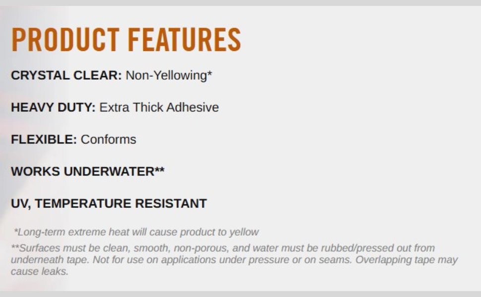 Crystal Clear Gorilla Tape delivers an ultra-tough, weather-resistant seal for all your repair needs. Designed with an extra-thick adhesive layer, this heavy-duty tape provides a strong, flexible bond that works both indoors and outdoors. It’s engineered to resist UV rays, extreme temperatures, and moisture — making it ideal for long-lasting repairs that stay clear over time. The non-yellowing formula ensures clarity even after exposure to sunlight and heat, while its conformable design adheres easily to smooth, non-porous surfaces. Perfect for emergency fixes, outdoor projects, patching, and sealing — even underwater applications when properly applied. Whether you’re repairing, protecting, or sealing, Crystal Clear Gorilla Tape combines durability, strength, and transparency for reliable performance in any condition.