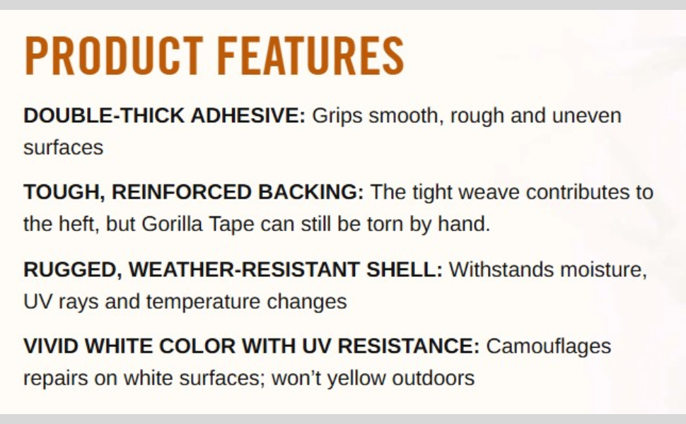 Experience unmatched strength and reliability with White Gorilla Tape, designed for the toughest jobs and long-lasting performance. This heavy-duty tape features a double-thick adhesive that firmly grips to smooth, rough, and uneven surfaces, making it ideal for a wide range of indoor and outdoor applications. Its tough, reinforced backing provides superior durability while still allowing you to tear it by hand for quick, hassle-free use. Built with a rugged, weather-resistant shell, Gorilla Tape withstands moisture, UV rays, and extreme temperature changes, ensuring your repairs stay intact in any condition. The vivid white color offers a clean, seamless look that blends perfectly on white surfaces and resists yellowing even under outdoor sunlight. Whether you’re fixing, patching, sealing, or bundling, White Gorilla Tape delivers professional-grade results that stand the test of time.