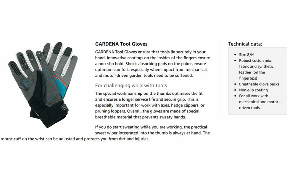 The GARDENA Tool and Wood Glove (Size M) is designed for demanding work with gardening tools and equipment, offering maximum grip, comfort, and protection. The silicone-coated palm ensures tools remain securely in hand, while the padded palm absorbs shocks, reducing strain during wood chopping and heavy-duty tasks. The adjustable wrist closure and flexible fabric provide a snug fit, and the breathable mesh keeps hands comfortable. The Mobile Touch function allows touchscreen use without removing gloves, making it practical and convenient. Certified with Oeko-Tex® Standard 100, these gloves are free from harmful substances, ensuring safe and long-lasting use.