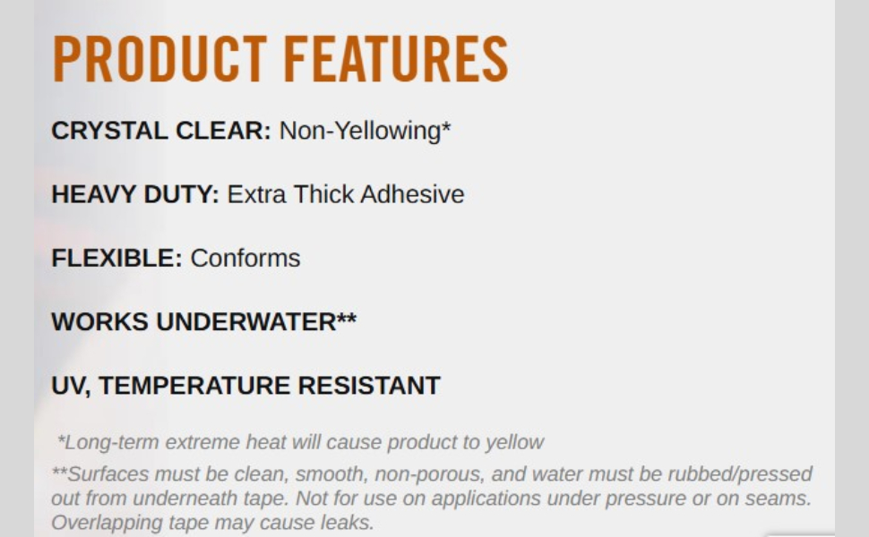 Crystal Clear Gorilla Tape features the adhesive strength of Gorilla Tape†, in a crystal clear tape that does not yellow outdoors. Made with a heavy-duty adhesive layer and waterproof backing for extreme durability. This tape is UV and temperature resistant - great for projects and repairs both indoors and out. Crystal Clear Gorilla Tape can be applied to wet surfaces and also works underwater