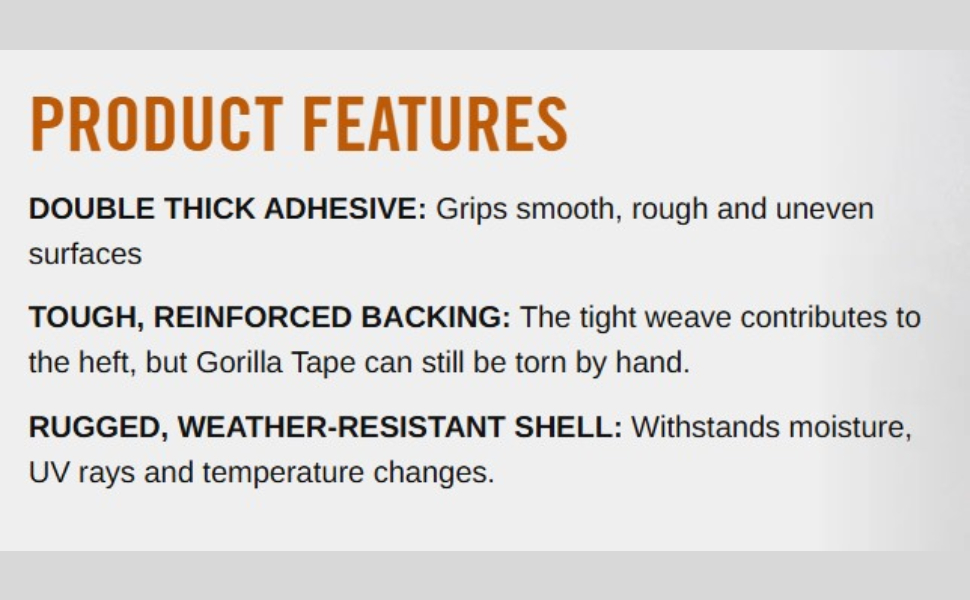 | DIRECTIONS | Use like any other tape. Tear Silver Gorilla Tape by hand or cut to size with a knife or scissors. Apply the tape carefully, smoothing out any pockets or rolls. That’s it. Enjoy the strength and durability of Silver Gorilla Tape! |