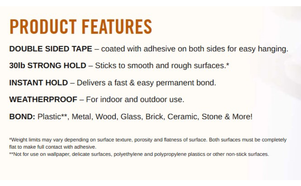 Gorilla Heavy Duty Mounting Tape is a double-sided tape that mounts in an instant, for a long-lasting, weatherproof bond. The industrial-strength double-sided tape delivers a heavy-duty bond that holds up to 30 pounds. Gorilla Heavy Duty Mounting Tape is perfect for indoor and outdoor projects and sticks to smooth and rough surfaces. Completing DIY projects is easy with this tough, double-sided tape. Mount, build, and repair!