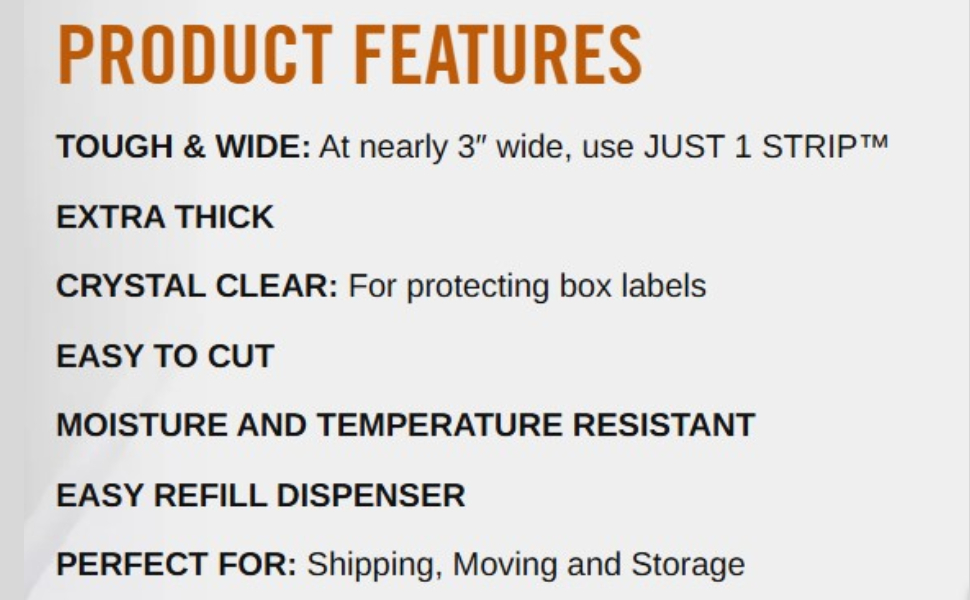 Gorilla Heavy Duty Packaging Tape Tough & Wide is nearly 3 inches wide and extra thick allowing you to can seal boxes with Just 1 Strip®. This tough packaging tape is split and tear resistant with an easy-to-grip dispenser. Gorilla Heavy Duty Packaging Tape is crystal clear and moisture and temperature resistant making it great for shipping, moving, and storage.