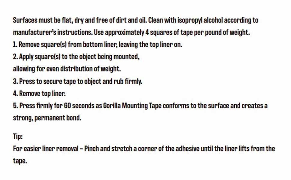 Gorilla Tough & Clear Mounting Tape Squares is a clear double-sided tape that mounts in an instant, for a long-lasting, weatherproof bond. The crystal clear adhesive tape won’t yellow over time. This mounting tape holds 1 pound per 4 squares of tape. Gorilla Tough & Clear Mounting Tape is perfect for indoor and outdoor projects and sticks to smooth and rough surfaces. Completing DIY projects is easy with this tough, double-sided tape. Mount, build, and repair