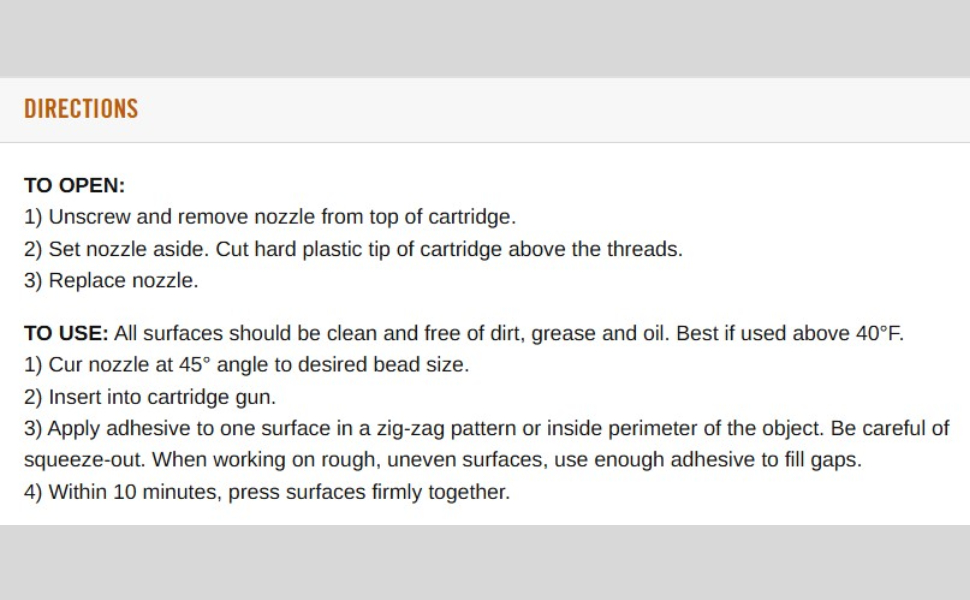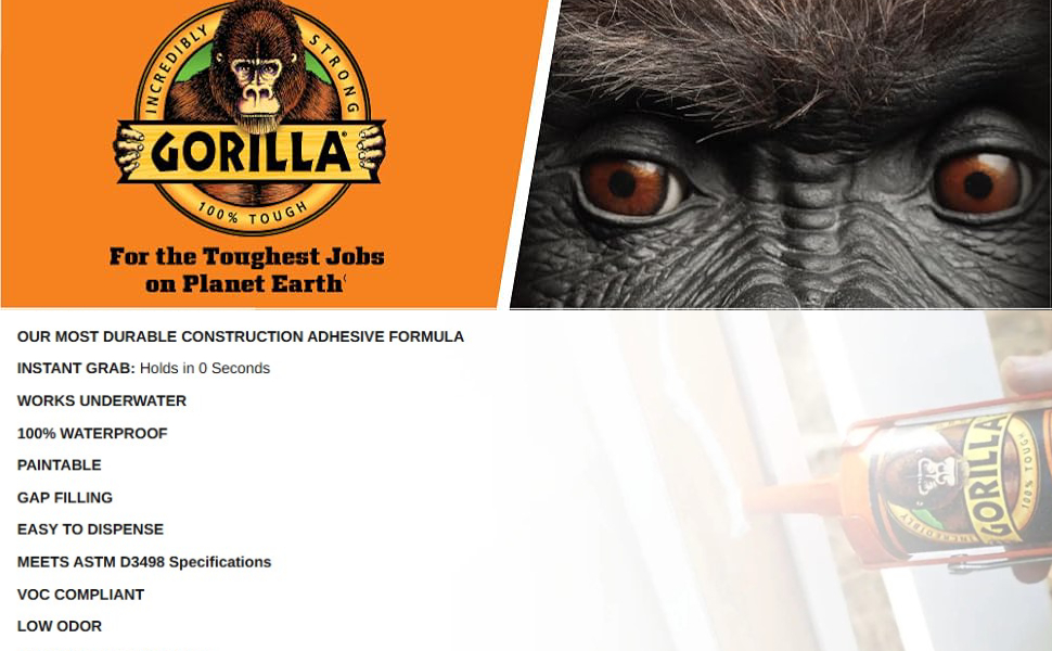 | STORAGE TIPS | Gorilla Heavy Duty Construction Adhesive Ultimate is best if stored in a cool, dry location with the nozzle attached filled with adhesive |
