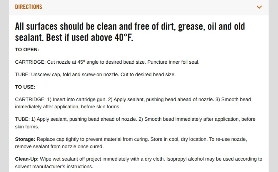 | Storage Tips | Store in a cool, dry location away from heat. Cartridge-store with nozzle attached. Tube-remove nozzle and replace cap tightly. |